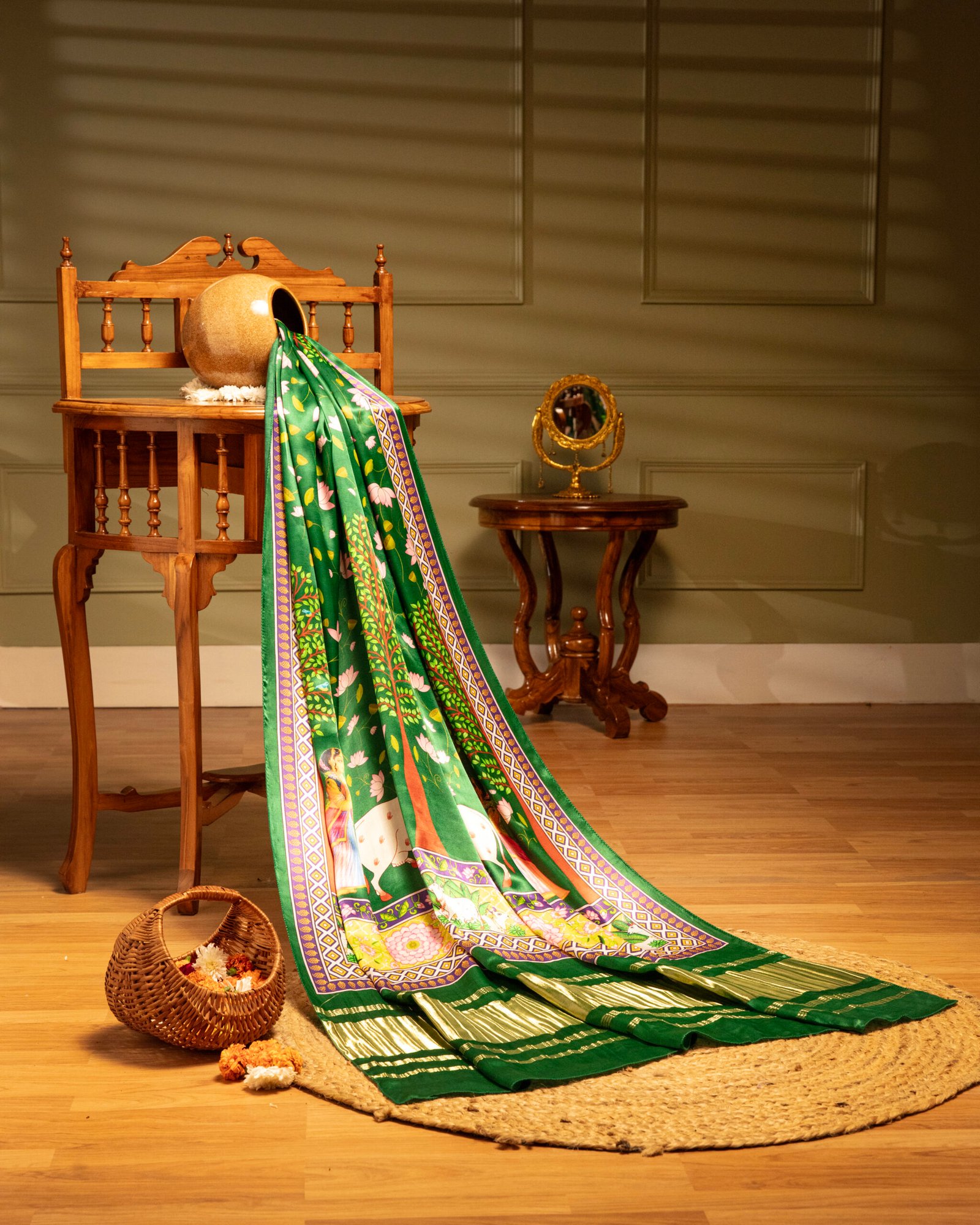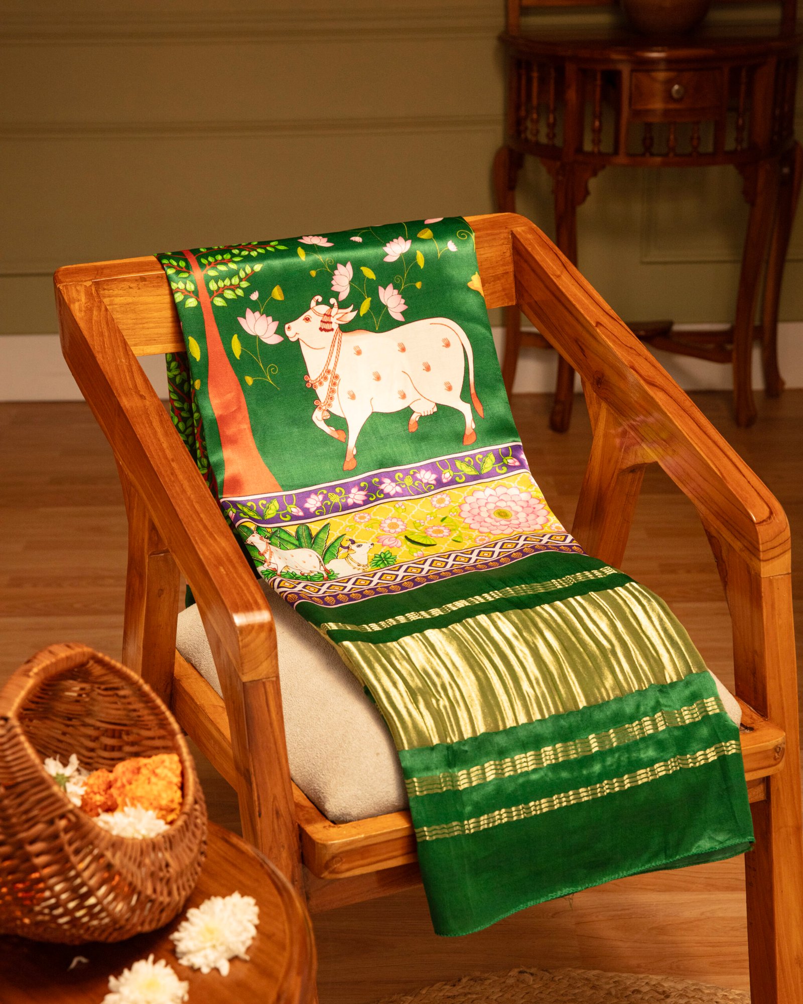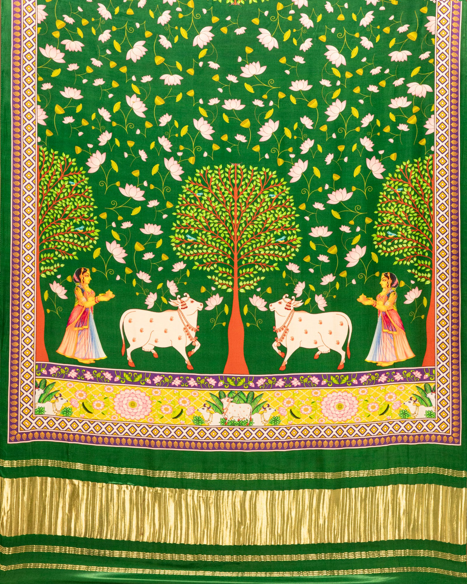Green Pichwai With Lotus Print Dupatta With tissue pallu
